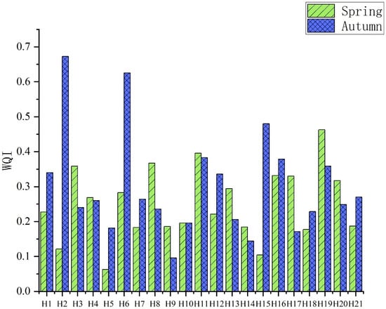 There are many evaluation methods for water quality, mainly an index system and fuzzy mathematics. The single water quality evaluation in this study adopted the single standard index method currently used in China. The single pollution index method is to analyze and evaluate the single index item by item through the evaluation criteria. Through the index calculation, the largest category of each factor is selected as the overall evaluation result of the sample. The comprehensive evaluation of water quality adopted the comprehensive index WQI method [