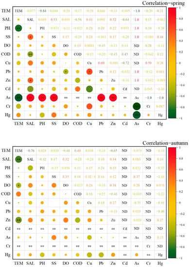 Figure 6. According to the correlational matrix, pH was positively correlated with the other, metals except Hg, indicating that the change in heavy metal concentration was likely to be the main influencing factor of pH change. Salinity was negatively correlated with Cd and Hg in spring, and negatively correlated with Cu in autumn, indicating that salinity may hinder seawater mixing and maintain high concentrations of heavy metals in seawater. The correlation between Pb and Cu was as high as 0.6 in spring and 0.19 in autumn, indicating that the two heavy metals were likely to have the same source, but seasonal changes in production activities lead to seasonal changes in different heavy metal contents. The correlation between Zn and Cd and other heavy metals was negative, indicating that Zn and Cd may be coming from a different source than the emission sources of the other heavy metals. Due to the lower detection of As in spring water samples and Cr and Cd in autumn water samples, the correlational analysis results of Cr and Cd in autumn were all zero. Cheung and Wong (1992) also showed that the As content in the ocean was very low compared with Cu, Cd, and Cr, and there was no specific As pollution source in Hong Kong, because As usually comes from natural sources [