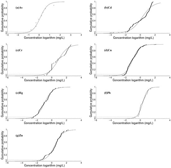 In the formula, x is the toxic value, μg/L or mg/L; μ is the mean value of toxicity, μg/L or mg/L; and is shape parameters, μg/L or mg/L. HC5 is the cumulative concentration when the proportion of harmful species on SSD curve reaches 5%. A smaller HC5 means that it represents a more toxic heavy metal. PAF is the proportion of harmful species corresponding to each measured concentration on the SSD curve, and its value can be directly obtained by software mapping. msPAF is the proportion of harmful species produced by multiple pollutant combinations, which can reflect the combined pollution of multiple pollutants in water.