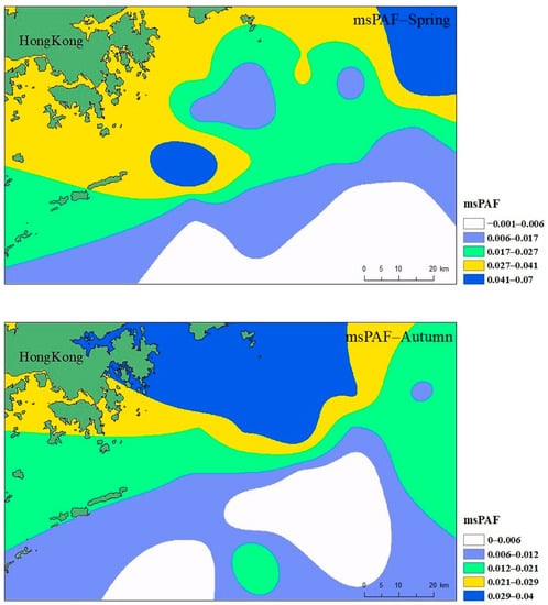 Figure 8 that the joint ecological risk spatial distribution of multiple heavy metals in the coastal waters of Hong Kong has obvious directivity, and gradually decreases from the near point to the far point along the Hong Kong coast. The autumn map shows that the combined ecological risk of various heavy metals gradually decreases from north to south, and the highest value appears near the coast of Shenzhen. Shenzhen is a typical city of China that has rapidly urbanized in the past 40 years. The ecological risk of the Daya Bay nuclear power offshore area in the east was higher, which may have been caused by marine transportation. This area was the berth of cargo ships transporting petrochemical products. The ballast water or sewage from cargo ships can increase heavy metal content [