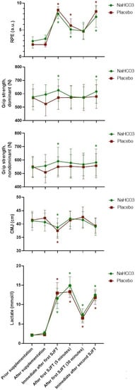 Table 1 presents RPE, grip strength, CMJ and lactate concentration in each group during different time points. The results were also presented graphically (Figure 1). For RPE, there was a main effect of time (F(1,8) = 43.3; p = 0.001; η2 = 0.82, (moderate)), with values after the second time point significantly higher in relation to before in both conditions (Table 1). There were no effects of group (p > 0.05) or supplementation × round interaction (p > 0.05). There were no interactions between groups and type of recovery at any time during the two types of recovery for RPE, grip strength, CMJ and lactate concentration (p > 0.05). However, there was a main effect of time for dominant grip strength (F(1,8) = 3.3; p = 0.01; η2 = 0.25, (small)), non-dominant grip strength (F(1,8) = 3.2; p = 0.01; η2 = 0.24, (small)), CMJ (F(1,8) = 8.8; p = 0.01; η2 = 0.47, (small)), and LC (F(1,8) = 124.2; p = 0.001; η2 = 0.92, (moderate)).