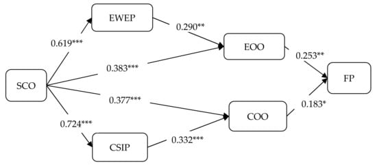 SEM results. SCO: social orientation of the firm; EWEP: employee well-being and equity practices; CSIP: corporate social involvement practices; EOO: employee-oriented outcomes; COO: community-oriented outcomes; FP: financial performance. * p < 0.05, ** p < 0.01, and *** p < 0.001.