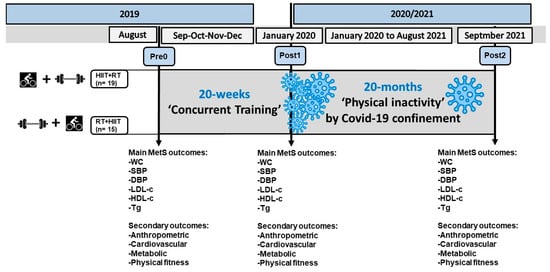 A lifestyle change program is characterized by the inclusion of regular exercise, and additionally other specific behaviours such as nutrition, and sleep patterns, among others (tobacco, and alcohol consumption) [,]. Regular exercise plays a critical role for some populations, such as morbidly obese candidates for bariatric surgery []. Thus, in addition to improving cardiometabolic risk factors for MetS, exercise training, such as concurrent training (CT, a combination of the same exercise session of resistance plus other endurance/aerobic or high-intensity interval training methodologies), promotes several other benefits, including better and healthier conditions for bariatric surgery and preparation for post-surgery challenges in the recovery period, with major success [,]. Unfortunately, little is known regarding the impact of the COVID-19 confinement on the cardiometabolic health benefits acquired before the pandemic through exercise training programmes such as CT in populations with morbid obesity. Along this line, it is relevant to mention that several countries and their health/sports systems were developing different exercise training programmes and training regimes at different levels (i.e., recreational, competitive, and professional) when the COVID-19 pandemic and confinement actions abruptly started. This situation meant that several exercise training programmes ceased and thus a high number of participants lost the exercise benefits that they had acquired before confinement. Hence, we hypothesized that 20 months of social distancing due to the COVID-19 pandemic affected the benefit of a concurrent training programme in morbidly obese patients. We aimed to describe the effects of the imposed COVID-19 social confinement on the cardiometabolic health benefits acquired through a CT programme started before the pandemic in populations with morbid obesity.