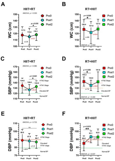 In the HIIT + RT group, WC showed significant changes from Pre1 to Post2 (115.0 to 118.1 cm, p = 0.035) (Figure 2, panel A), whereas, in the RT + HIIT group, WC showed significant changes from Pre0 to Post1 (126.4 to 121.6 cm, p = 0.028) (Figure 2, panel B). SBP showed significant changes from Post1 to Post2 (126.6 to 132.8 mmHg, p = 0.041) (Figure 2, panel C), whereas, in the RT + HIIT group, SBP showed significant changes from Pre0 to Post1 (142.2 to 135.0 mmHg, p = 0.026) (Figure 2, panel D). For DBP, the RT + HIIT group showed significant changes from Pre0 to Post1 (85.0 to 93.1 mmHg, p = 0.015) (Figure 2, panel F).