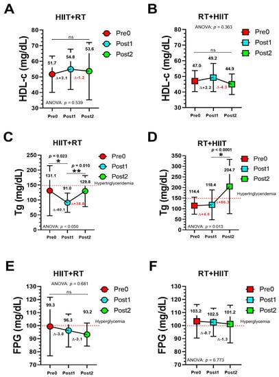 Tg in the HIIT + RT group showed significant changes from Pre0 to Post1 (131.1 to 91.0 mg/dL, p = 0.023) and from Post1 to Post2 (Figure 3, panel C), whereas Tg in the RT + HIIT group showed significant changes from Pre1 to Post2 (118.4 to 204.7 mg/dL, p < 0.0001) (Figure 3, panel F). There were no significant differences in HDL-c (Figure 3, panels A and B) and FGP in both groups (Figure 3, panels E and F) (p > 0.05).