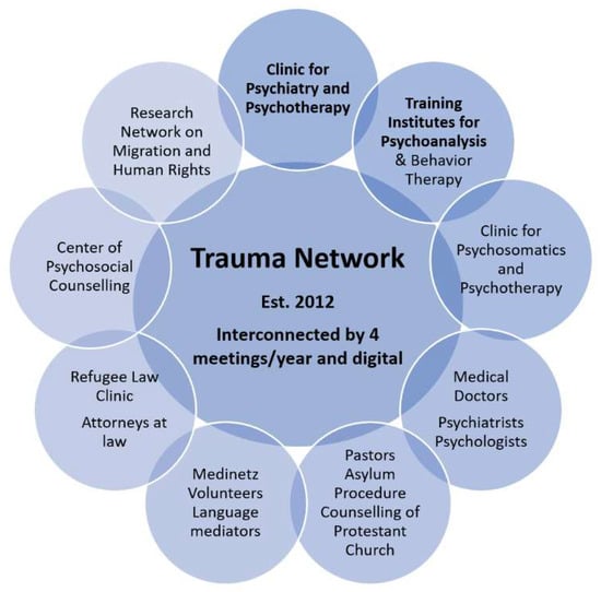 Figure 1 provides an overview of the different actors in the network. Particularly in the treatment of trauma sequelae, cross-collaborations between, for example, practitioners, researchers, and advocacy groups have been shown to offer more benefits than the usual translation of science into clinical practice [,,,,].