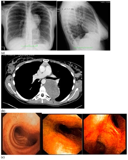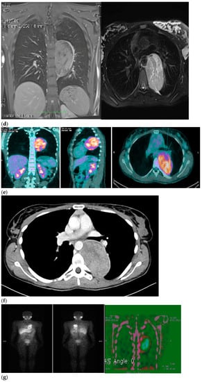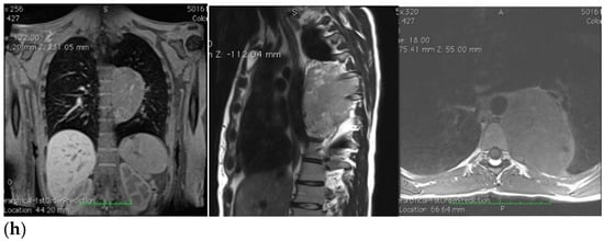 Therefore, her GP prescribed a chest X-ray, which revealed a voluminous opacity in her posterior mediastinum on the left (Figure 1a); subsequently, the GP referred the patient to a thoracic surgeon, who prescribed a series of imaging (Figure 1b–h) tests to biologically circumscribe the lesion, in order to evaluate its metabolic activity and its eventual malignancy. After these further investigations, the patient’s histopathological diagnosis was of poorly differentiated neuroblastoma ALK + (IIC), I stadium [,]. The patient was inserted in the operating room schedule for surgical excision.