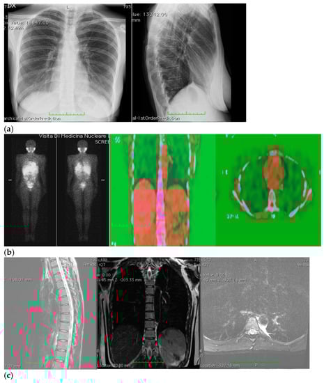 (a–c) Imaging assessments for post-surgical evaluation. (a) X-rays. (NOTE: No signs of ongoing pleuropulmonary lesions, free pulmonary bases, each hilum had a normal morphology, heart and aorta within normal limits, normal mediastinum). (b) Total-body scintigraphy with metaiodobenzylguanidine. (NOTE: No longer detectable pathological activity in the left hemithorax. No other areas of significant radiopharmaceutical were observed). (c) Thorax MRI with Gadoteridol. (NOTE: Outcomes of the surgical removal of the well-known left paravertebral lesion and a thin fluid layer corresponding to the surgical cavity. Very little slightly hyperintense remaining tissue in T2-weighted images, with subtle contrast enhancement and a maximum size of about 15 mm, at T6–T6 level, on the left side of the intervertebral foramen, close to the same level costovertebral joint—in a clinical picture which required MRI monitoring with contrast medium overtime).