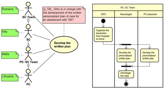 ) adopted in the UML class diagram to associate two objects of the system in a part-whole or part-of relationship has been introduced in our methodology to aggregate different types of professionals in a team that is involved as a whole in a specific use case (left side of Figure 1). This is crucial, considering, for instance, that health and social care professionals can manage a child’s pathway either working as individuals carrying out specific professional-related activities or working in close collaboration in a fully integrated system as part of a multi-disciplinary team. In the example reported below (left side of Figure 1), the activity of developing a written plan is performed by a secondary care physician (SC) in Italy, by a team of professionals belonging to the secondary care (SC Team) setting in Romania, and by a primary care physician (PC) in Lithuania, while in Malta, professionals belonging/part of/the primary and secondary care work in a team (PC–SC Team) to accomplish this task. This aspect is also described in the activity diagram representing the PC–SC Team using an overall swim lane that can be subsequently divided into swim lanes to list the activities performed by each professional that composes the team (right side of Figure 1). This makes it possible to capture not only the presence of a multidisciplinary team, but also to detail the different types of professionals that compose the team and their roles.