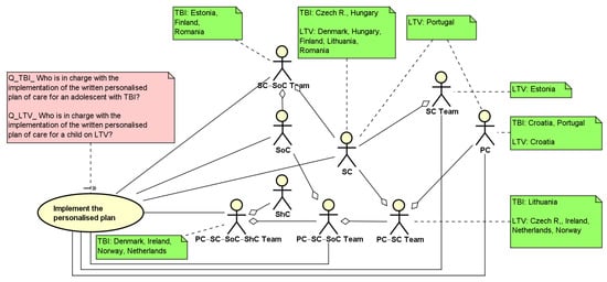 Figure 3 shows the UML use case diagram related to the implementation of the personalized written care plan for an adolescent with TBI and children on LTV. There is a high variety of team composition across countries and also between health conditions. The wider level of team composition, comprising PC, SC, Social Care (SoC), and School Care (ShC) professionals is present in a limited number of countries (Denmark, Ireland, the Netherlands, and Norway) in the treatment of TBI, while in the treatment of LTV, the same countries, with the exception of Denmark, comprises the collaboration of professionals from the primary and the secondary care settings. The presence of other types of teams is higher in TBI than in LTV in eight countries (Denmark, Estonia, Finland, Ireland, Lithuania, the Netherlands, Norway, and Romania). In three countries, the written plan is implemented by individual professionals both in TBI and LTV (Croatia, Hungary, Portugal).