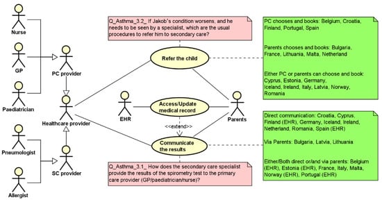 Figure 4 shows the use case diagram related to the referral as well as to the communication procedures as part of the work presented in []. In particular, considering the referral procedure, all CAs have reported that the PC prescribes the visit and refers the child to a specialist. Differences among countries are found considering the booking procedures. In particular, in five countries (Belgium, Croatia, Finland, Portugal, Spain), the primary care physician directly chooses the specialist and books the visit, while in another five countries (Bulgaria, France, Lithuania, Malta, and the Netherlands), these activities are performed by the family. In the remaining countries, either parents or the GP/pediatrician can choose the professional and book the visit depending on the level of collaboration among professionals (also co-location). Alternatively, parents can decide to choose the specialist and book the visit. Considering the communication of the spirometry results, the specialist reports to the primary care professional either via a direct channel between professionals or involving the parents as conduits of the transmission of results. As highlighted by the green note, in nine countries, there is a direct communication among professionals using a shared EHR (Finland, Spain), a letter (Croatia, Germany, Iceland, Ireland, the Netherlands, Romania) or a report (Cyprus), while in three countries (Bulgaria, Latvia, Lithuania), this task is conducted by parents who generally have a letter containing the results of the specialist’s visit. In the remaining countries, the communication can be conducted by parents or by the specialist depending on the availability of a shared record within the specific region, or on the asthma and exacerbation severity as assessed by the specialist.