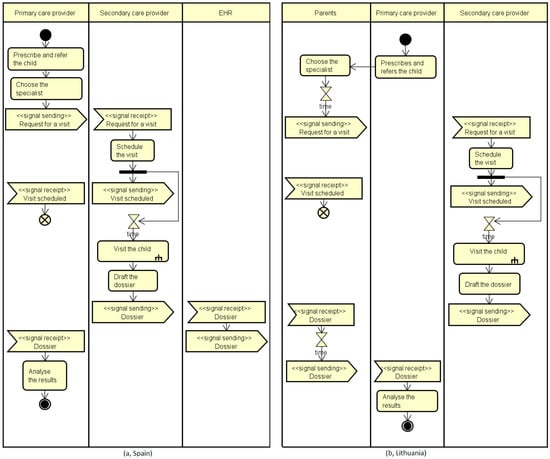 Starting from the results reported in the use case diagram, two countries have been analyzed and modeled using the UML activity diagram (Figure 5) to capture the level of complexity of the process in terms of its straightforwardness in the primary care–secondary care collaboration/interaction procedures. On the left side (Spain), both activities are directly performed by the health professionals, taking advantage of the availability of a shared electronic health record (EHR swim lane) with no further burden for the parents. On the right side (Lithuania), the parents are involved both in the referral and in the communication procedures, implying certain possible wait time actions represented by the hourglass and a full involvement of the parents in the organization of the child pathway (to choose and book the specialist’s visit as well as to communicate the spirometry results to the PC physician).