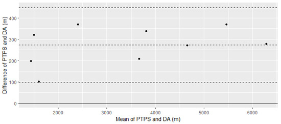 Bland–Altman plot comparing Polar Team Pro sensors and desktop analysis. Key: PTPS, Polar Team Pro sensor; DA, desktop analysis; middle dashed line, mean difference between PTPS and DA; upper dashed line, +1.96 SD from mean difference; lower dashed line, −1.96 SD from mean difference.