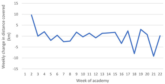 As per the weekly total distance covered, there was an increase of approximately 10 km in distance covered during Week 2 (Figure 3). No other large changes appeared to occur during most of the academy. However, over the last five weeks, larger fluctuations could be seen, ranging from approximately −9 to 4 km changes from week to week.