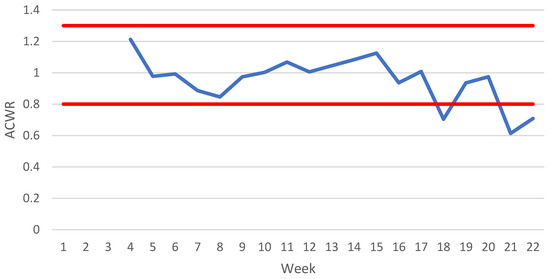 Average ACWR of distance covered across seven academy classes. Key: Red lines signify 0.80–1.30 optimal range as proposed by Gabbett [20]; ACWR, acute:chronic workload ratio.