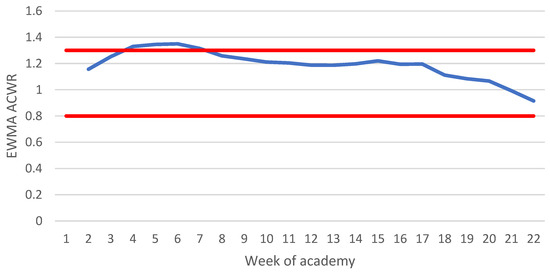Average EWMA ACWR of distance covered across seven academy classes. Key: Red lines signify 0.80–1.30 optimal range as proposed by Gabbett [20]; EWMA ACWR, exponentially weighted moving average acute:chronic workload ratio.