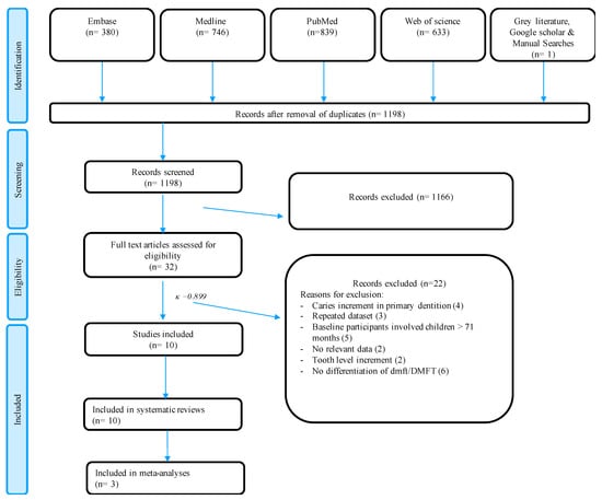 Figure 1 details the screening process in accordance with the PRISMA guidelines. A systematic literature search of records identified 1198 records after removing duplicates. A total of 32 articles were retrieved for full text reading and evaluation. Ten articles were found to be eligible and included for qualitative synthesis [,,,,,,,,,] (Kappa κ: 0.899). The list of excluded studies and the reasons for exclusion are shown in Supplementary Material File S2.