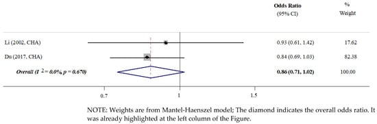No studies suggested gender as a significant factor associated with increased caries risk in permanent teeth [,,]. As shown in the meta-analyses, boys and girls carried similar risk of developing caries in their permanent teeth (OR, 0.86; 95% CI 0.71, 1.02; p = 0.670) [,] (Figure 4).