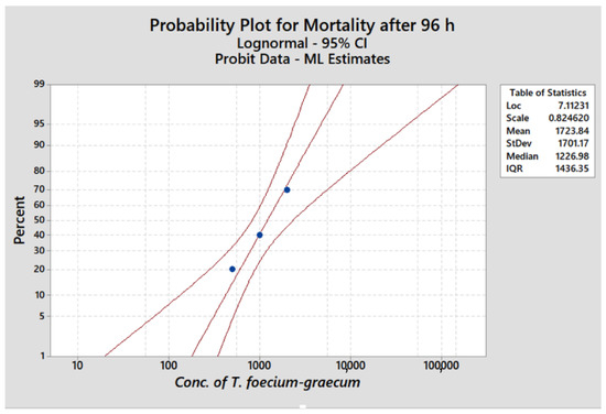 The 96 h LC50 value of the fenugreek for C. carpio was 1226.98 ± 259.89 mg/L with a 95% confidence interval of 832.29 to 2354.72 mg/L, which showed the toxicity of the T. foenum-graecum extract to the common carp at a higher concentration (Figure 1).