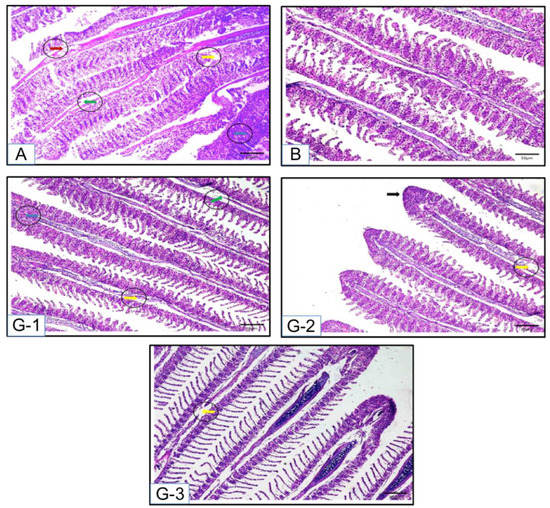 Photomicrographs (400×) of gills of the common carp (C. carpio) experimentally exposed for 28 days to CuO NPs (1.50 mg/L) as positive control (A; C-positive group), to no treatments as negative control (B; C-negative group), and to different concentrations of the fenugreek (T. foenum-graecum) extract at 100 mg/L (G-1), 125 mg/L (G-2), and 150 mg/L (G-3). Fish gills from the positive control showed various histological abnormalities including degenerative epithelium (green arrow), complete degeneration (red arrow), fused lamellae (blue arrow), and necrosis of primary lamella (yellow arrow). Fish from groups treated with the fenugreek showed dose-dependent curative effects on the gill epithelium (black arrow). The scale bar represents 10 µm; five fields of one histological section per sample were analyzed.