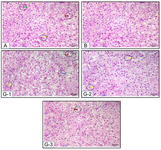 Photomicrographs (400×) of livers of the common carp (C. carpio) experimentally exposed for 28 days to CuO NPs (1.50 mg/L) as positive control (A; C-positive group), to no treatments as negative control (B; C-negative group), and to different concentrations of the fenugreek (T. foenum-graecum) extract at 100 mg/L (G-1), 125 mg/L (G-2), and 150 mg/L (G-3). Fish livers from the positive control showed various histological aberrations including vacuolization (red arrow), degenerative hepatocytes (yellow arrow), dilated sinusoid (blue arrow), and complete degeneration (green arrow). Fish from groups treated with the fenugreek showed dose-dependent curative effects in their livers. The scale bar represents 10 µm; five fields of one histological section per sample were analyzed.