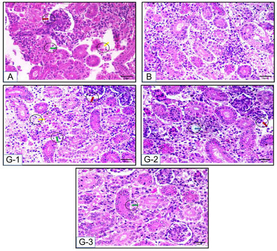 Photomicrographs (400×) of kidneys of the common carp (C. carpio) experimentally exposed for 28 days to CuO NPs (1.50 mg/L) as positive control (A; C-positive group), to no treatments as negative control (B; C-negative group), and to different concentrations of the fenugreek (T. foenum-graecum) extract at 100 mg/L (G-1), 125 mg/L (G-2), and 150 mg/L (G-3). Fish kidneys from the positive control showed various histological abnormalities including swollen tubules (green arrow), abnormal glomerulus (red arrow), and complete degeneration (yellow arrow). Fish from groups treated with the fenugreek showed dose-dependent curative effects in their kidneys even if some tissue damages were observed, such as necrosis and tubular degeneration (blue arrow). The scale bar represents 10 µm; five fields of one histological section per sample were analyzed.