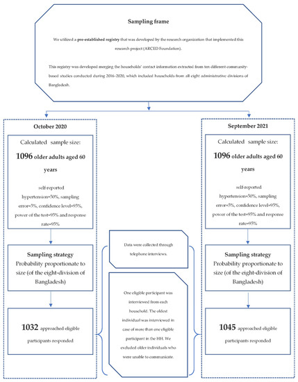 This repeated cross-sectional study was conducted on two successive occasions, i.e., October 2020 and September 2021, overlapping with the first and second waves of the COVID-19 pandemic in Bangladesh. Data was collected from older Bangladeshi adults aged 60 years and above through telephone interviews. As we could not conduct the data collection face-to-face during the COVID-19 pandemic because of the restrictions in movements, we utilised a pre-established registry as a sampling frame that was developed by the ARCED Foundation. This registry was developed by merging the households’ contact information extracted from ten different community-based studies conducted by the ARCED Foundation to explore different social issues during 2016–2020, which included households from all eight administrative divisions of Bangladesh. This registry has also been used as a sampling frame in our previous studies [33,34]. Considering a 50% prevalence with a 5% margin of error, at the 95% confidence level, 90% power of the test, and a 95% response rate, a sample size of 1096 was calculated. However, during the 2020 survey, only 1032 of the approached eligible participants responded to the study, resulting in an overall response rate of approximately 94%. During the 2021 survey, 1045 of the approached eligible participants responded to the study, resulting in an overall response rate of approximately 95%. Based on the population distribution of older adults by geography in Bangladesh, we adopted a probability proportionate to size (of the eight divisions) approach to randomly select the desired number of older adults from each division [22]. Notably, the samples were selected randomly from the registry on two successive occasions (the 2020 survey and 2021 survey). Therefore, the sample was not identical on the two occasions, while the population remained the same. In fact, we ensured that the samples were not overlapped during the two rounds of survey and if there was any incidence of the same sample of the first round selected in the second round, it was replaced by another random selection. The detailed sampling strategy is presented in Figure 1.