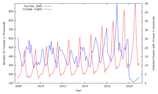 The secondary data were obtained from the National Institute of Public Health (NIPH) of the Republic of Slovenia [43] and the Statistical Office of the Republic of Slovenia’s (SORS) SISTAT website [44]. The data on 12 prevailing infections in Slovenia were obtained from the NIPH [44]. The data on tourist arrivals for the same periods were obtained from the SORS [43]. Tourist arrivals are a dependent variable and are accompanied by viruses, as shown in Figure 1.