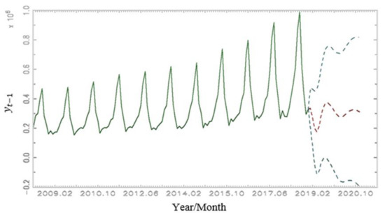 Forecast of tourist arrivals for 24 months. Source: Authors’ calculations. Note: Data vector is from January 2008 to December 2018; upper, middle, and lower forecast levels are from January 2019 to December 2020.