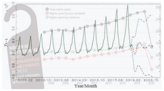 The result has immense implications for science. The predicted feature was overlaid with two images to confirm the modelling structure and reliable results (Figure 3). The first overlaid image is the Eurostat report on the decline in tourism demand in the European Union, and the second overlaid image is in Figure 2. It is obvious that the prediction of some authors [2] was incredibly accurate and the adapted result of this study significates the decline in tourist arrivals. Moreover, from the overlaid images (Figure 3), it is evident that the theoretical epidemic, i.e., the spread of the viruses, started in 2019 which was before the confirmation of the spread of the COVID-19 outbreak [46].