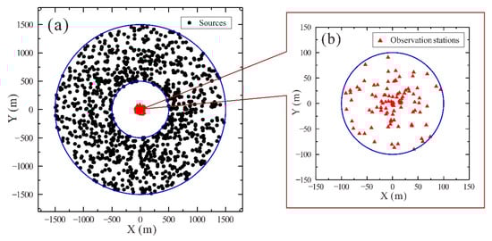 Spatial distribution diagram of random sources and observation array: (a) random sources; (b) observation array.