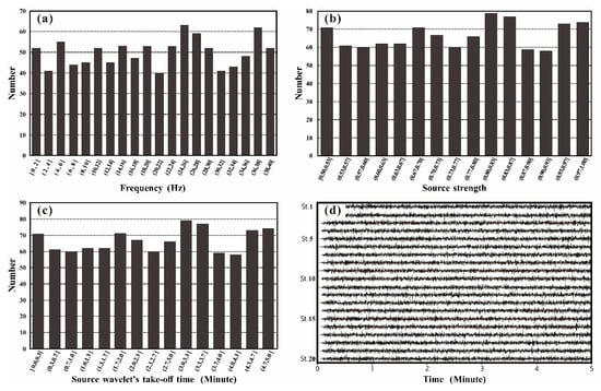 Theoretical synthesis of microtremor signals: (a) histogram of dominant frequency distribution of sinusoidal exponential decay wavelet; (b) source strength distribution histogram; (c) distribution histogram of source wavelet take-off time; (d) waveform diagram of microtremor signals of 20 stations synthesized by model 1.