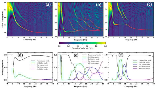 The fraction of Rayleigh wave energy in each mode can be used to explain why the dispersion curve in some frequency bands of the Rayleigh wave dispersion diagram was absent. In an analysis of multi-mode Rayleigh wave signals, Tokimatsu [] initially developed a dielectric response function and provided a method for calculating the percentage of multi-mode Rayleigh wave energy. The calculation results of the energy proportion for Models 1, 2, and 3 of the Rayleigh waves are shown in Figure 3d–f, respectively, only considering the fundamental and first four high modes. The energy distribution diagram makes it clear that the presence of each mode’s dispersion curve in the dispersion diagram depended strongly on the energy proportion of each mode’s Rayleigh wave. If the energy proportion was large, there was a dispersion curve in the dispersion diagram; otherwise, there was not one.