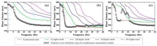 To demonstrate the superiority of the frequency-Bessel transform method, the extended spatial autocorrelation method was supplemented to process the synthetic theoretical microtremor signals. Similarly, this paper calculated the Rayleigh wave dispersion curve for the frequency range of 0.2–40 Hz. As shown in Figure 4, for each geological model, only one dispersion curve of Rayleigh wave was obtained using the extended spatial autocorrelation method. Meanwhile, for Model 2 and Model 3, the dispersion curves obtained were quite different from the theoretical fundamental dispersion curves. Combined with Figure 3d–f, the dispersion curves obtained based on the extended spatial autocorrelation method were the result of the superposition and coupling of the fundamental Rayleigh wave and the higher-mode Rayleigh waves [].