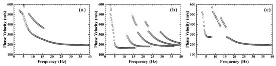 In this study, the synthetic theoretical microtremor signals were processed using the frequency-Bessel transform method. The computed frequency range must be supplied to calculate the Rayleigh wave dispersion diagram. Since the dominant frequency of the source wavelet was randomly distributed in the range of 0.01–40 Hz, this paper only calculated a Rayleigh wave dispersion diagram with the frequency range of 0.2–40 Hz. The stations in this study were first paired, and the cross-correlation functions of each group of stations were then determined. Then, the frequency-Bessel transform was applied to the resulting cross-correlation function over an acceptable range of phase velocity variation using Formula (1). Finally, the Rayleigh wave dispersion diagrams of the three geological models could be obtained, as shown in Figure 3a–c.