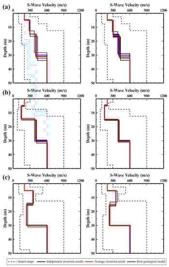 Inversion results of multi-order dispersion curves. The left and right figures correspond to the traditional and newly proposed inversion objective functions, respectively. (a) Model 1; (b) Model 2; (c) Model 3.