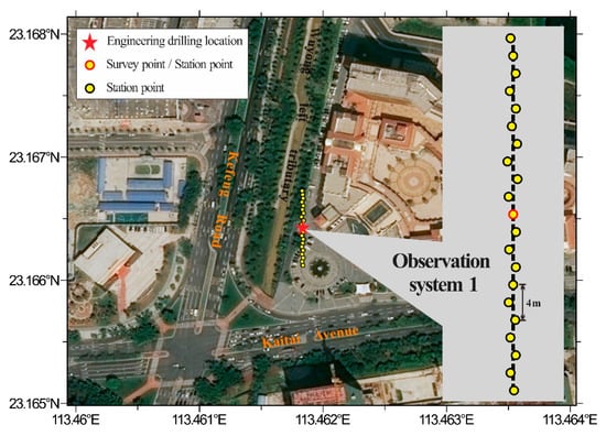 The experimental site was located next to a project’s drilling hole at the DOPO International Plaza in Huangpu District, Guangzhou (Figure 7). The site was flat and open, making it suitable for data acquisition. As a part of the South China paraplatform, Guangzhou straddles the two major tectonic units of central and northern Guangdong. This region sees frequent crustal activity through neotectonic movement, forming different geological structures, such as fold zones, fault zones, and inland fault basins []. A geotechnical investigation report suggested that the site’s upper part of its quaternary formation (Q4) was Qml and Qpal, and the underlying bedrock was late Silurian granite. Additionally, according to the weathering degree of the rock, the site was divided into completely weathered, strongly weathered, and moderately weathered zones.