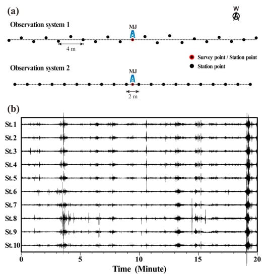 Waveform of observation array and part of measured microtremor signals. (a) Schematic diagram of observation array; (b) waveforms of microtremor signals at part of observation stations.
