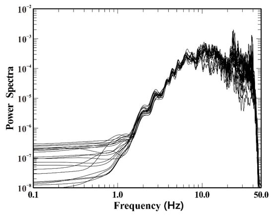 Since there was a parking lot close by, only the hour at midday when there were few vehicles was chosen for monitoring for safety concerns. Compared to the randomly distributed observation array, a linear or nearly linear observation array is more convenient to deploy and easier for determining the detection point. Therefore, linear and nearly linear observation arrays were employed to collect microtremor signals in this engineering application. The observation system is depicted in Figure 8a. A total of 21 stations made up observation system 1, which was roughly linear but had inconsistent distances between adjacent stations. For observation system 1, the minimum distance between pairs of stations was 2.02 m and the maximum was 40.5 m. Observation system 2 was linear, including 21 stations, and there were 1 or 2 m between each station. Obviously, the minimum distance between pairs of stations was 1 m, and the maximum was 38 m for observation system 2. Moreover, the number of station pairs with different radii in observatory array 1 was 71, while the number in observatory array 2 was only 30. Two independent observations using these two systems were conducted, each lasting 20 min and using a sampling frequency of 100 Hz. Figure 8b depicts the waveforms of microtremor signals from some observation stations corresponding to observation system 1. All observation instruments were of the same batch and model, which made it unnecessary to remove the instrument response. Figure 9 displays the power spectra of the microtremor signals obtained through the smoothing process of the Parzen window, indicating an intuitive analysis of the energy of the measured microtremor signals. The frequency band of 5–40 Hz was where the strongest energy was present in the power spectra of 21 stations.