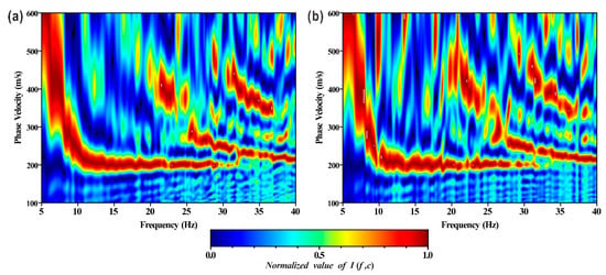 The measured microtremor data collected by the two observation systems were processed based on the above steps. The calculation results are shown in Figure 10. Similarities between Figure 10a,b included the presence of distinct fundamental and high-order dispersion curves of multiple modes, as well as the energy of the fundamental Rayleigh wave being stronger in the low-frequency part, whereas the energy of the high-mode Rayleigh wave was dominant in the high-frequency part. The difference was that the dispersion curve in Figure 10a was more continuous and clear at low frequencies, and the peak area was likewise more concentrated with high resolution. In general, the imaging quality of the dispersion diagram obtained with observation system 1 was superior to that of system 2 because system 1 could obtain more sample values of the cross-correlation function, which was more conducive to the superposition and summation of finite discretions.