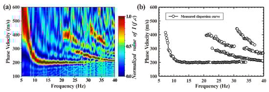 Additionally, since the kernel function of a Rayleigh wave’s Green function has frequency dispersion [], also presents dispersion characteristics. When the appropriate frequency range and phase velocity range are given, a series of or values can be calculated according to Formula (1), and the formed two-dimensional image is called a Rayleigh wave dispersion diagram.