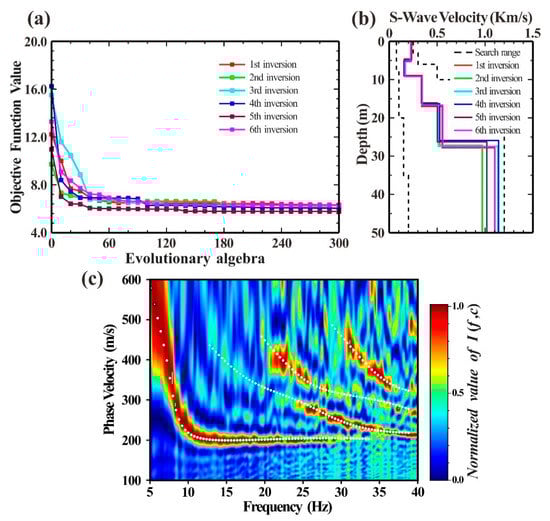 Figure 11b displays the multi-mode dispersion curve of the Rayleigh wave picked up from Figure 11a. As can be observed, it was simple to identify the fundamental mode of the dispersion curve, but it was more difficult and prone to misidentification to identify the higher modes without any prior information. Therefore, this study proposed a new inversion objective function based on a genetic algorithm to process the selected multi-order dispersion curve of the Rayleigh wave. Figure 12 displays the outcomes of six independent inversions of the selected fundamental and higher-mode dispersion curves. The six results pointed to a good consistency between the objective function change curve and the S-wave velocity structure obtained by inversion, as well as the presence of a clear, low-speed interlayer in the second layer, which suggests that the inversion’s multiple solutions could be minimized by combining the inversion of fundamental and high-mode dispersion curves.