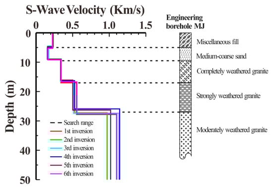 As illustrated in Figure 8a, there was an engineering borehole MJ close to the detection spot. To verify the accuracy of the detection results, the stratigraphic structure information obtained by inversion could be compared with the borehole information. According to the results of six independent inversions in Figure 13 and the borehole histogram, the inversion results were fairly accurate representations of the actual stratigraphic structure. Additionally, the low-speed soft interlayer, which corresponded to the medium-sand seam in the borehole histogram, was well-characterized in the observation point’s underlying structure. The detection results supported the frequency-Bessel transform method’s ability to successfully extract the multi-order dispersion curve of the Rayleigh wave from the microtremor data array. It also demonstrated that the newly proposed inversion objective function can effectively utilize both fundamental and high-mode Rayleigh wave information while preventing mode misidentification and improving the accuracy of the microtremor survey.