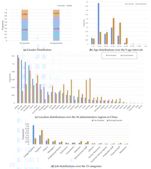 The distributions of demographic variables of the dataset. (a) The gender distribution, represented by the proportions of female and male subjects in Pre-/During-Disaster, respectively. (b) The age distribution, represented by the proportions of the 9 age intervals in each period. (c) The distributions of the subjects’ locations, covering the 34 administrative regions in China. (d) The distributions of the subjects’ jobs, covering the 15 major categories. Note that for each period (Pre-/During-Disaster), the distributed proportions of a given demographic variable added up to 1.