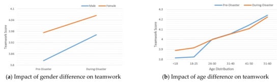 Figure 2a compares the gender difference in teamwork (in the whole dataset). Results showed that gender was statistically related to the changes in teamwork scores. Compared with that of Pre-Disaster, the disaster significantly boosted the level of teamwork for both males (MDuring = 3.9613, SDDuring = 0.6430) and females (MDuring = 4.0649, SDDuring = 0.6319) with (t = 5.3167, p < 0.001, Cohen’s d = 0.2101), and (t = 6.4578, p < 0.001, Cohen’s d = 0.1451), respectively. It was discovered that females always showed a higher teamwork tendency than males. Even without COVID-19 pandemic impact, just taking Pre-Disaster as a general time period, females (M = 3.9733, SD = 0.6305) inherently had a significantly higher teamwork score than males (M = 3.8230, SD = 0.6730) with t = 9.8609, p < 0.001, Cohen’s d = 0.2305.