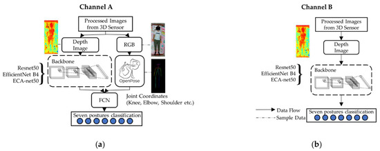 We exploited six model architectures, which were three deep learning models (ResNet-34, EfficientNet B4, and ECA-Net50), trained using depth camera images, with (Channel A) and without (Channel B) pose estimator input, as shown in Figure 3 [39]. With regard to the deep learning models, in brief, ResNet (short for residual network) [40] employed a residual network architecture and solved the vanishing gradient problem using traditional deep neural learning by skipping some layers (shortcut connection). EfficientNet [41] utilized a compound scaling method that sedulously scaled the network depth, width, and resolution, and was proven to outperform traditional CNNs with arbitrary and uniform network dimensions. ECA-Net (short for efficient channel attention module for deep CNNs) [42] is a lightweight model that aimed to avoid channel dimensionality reduction, but maintained the consideration of cross-channel interactions through a fast 1D convolution with a kernel predetermined using channel dimensions.