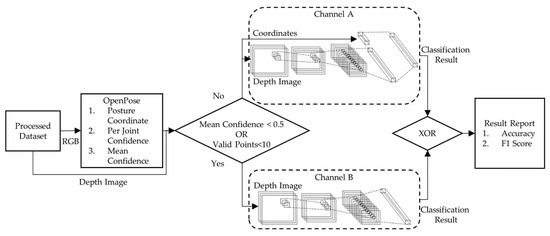 Figure 4 shows the system level after the models were trained. The test data were input into the pose estimator (OpenPose) to generate point coordinate information and confidence levels. The selection of Channel A or B for a particular piece of data sample was determined with the confidence level of the coordinate points generated using the pose estimator. If the confidence level of the pose estimation averaged over all point coordinates was less than 0.5, or the number of valid points (i.e., NULL confidence level) was less than 10, the data were delivered to Channel B without a pose estimation, shown in Figure 4. Otherwise, the data headed to Channel A with a pose estimation. The final prediction was determined with an exclusive OR (XOR) of outputs from Channels A and B (Figure 4).