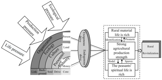 Sustainable development has been an enduring topic in the pursuit of a harmonious human–land relationship because it not only sustains the interests of the state, society, and enterprises but is also crucial to the realization of human civilization and individual welfare [59]. China’s countryside is highly diverse and uneven due to its unique natural, social, and multi-ethnic characteristics [60,61]. Therefore, the countryside also faces a series of pressures in the process of development, such as life pressure, production pressure, and ecological pressure. For these characteristics, the Chinese government stresses that industry is the core of rural revitalization; talent is the driving force of rural development; culture is the soul of a region; ecology is the support point of rural revitalization; and organization is the link between economic management and administration in the implementation of rural revitalization [34].