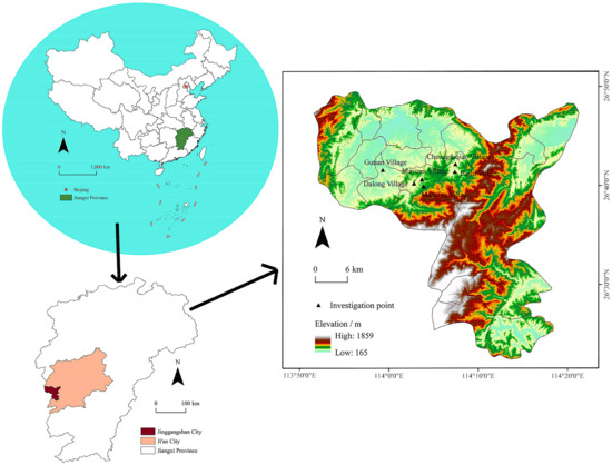 According to the criteria for identifying key counties for poverty alleviation and development in rural China [64] and based on the education, health, culture, employment, economy, and social security conditions, a total of 4638 poor households containing 16,934 people were identified in Jinggangshan. These were among the first batch of key counties for poverty alleviation and development in China [65]. In 2017, Jinggangshan became one of the first counties in China to escape poverty, and its poverty incidence rate dropped from 6.06% to 1.60% [66], laying a solid foundation for further sustainable rural development. The study area was centered on Maoping Village (MP) in Jinggangshan, which is a nationally famous revolutionary cultural site and radiates surrounding villages with strong revolutionary culture, with a total area of 268.703 km2 and a total population of 25,137. Dalong Village (DL) is where the town government of Maoping Town is located. Berlu Village (BL) is located in the middle of the revolutionary base area in Jinggangshan Mountains. Changfuqiao Village (CFQ) is a place where there are many talents. Gutian Village (GT), which is located at the Long-shi exit of Jingmu Expressway, has convenient transportation links to other villages. Mayuan Village (MY) is a model village with rich resources. The area retains old revolutionary sites where important meetings were conducted, including the residences of the old revolutionaries. This was one of the main birthplaces of the Jinggang Mountain spirit and is an important demonstration area for the implementation of the rural revitalization strategy in China.