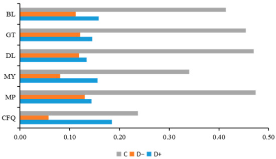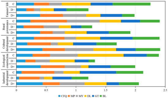The overall rural revitalization implementation level was clearly differentiated in the six villages. Based on the evaluation index of the rural revitalization implementation level and the resource characteristics of the rural revitalization demonstration villages in Jinggangshan, we calculated the closeness (C) value of each village using the TOPSIS model (Figure 6). The top-ranked village was MP, with a closeness (C) value of 0.474, followed by DL (C value of 0.470); GT (C value of 0.454); BL, which is located in the middle of the Jinggangshan revolutionary base area (C value of 0.414); MY (C value of 0.340); and finally CFQ (C value of 0.237). By analyzing the closeness ranking of each demonstration village, we concluded that there were differences in the level of rural revitalization among the six model villages, and the differences were relatively clear, with the maximum closeness value being twice as high as the minimum closeness value. The implementation level of rural revitalization in areas with strong revolutionary culture was significantly higher than that in other areas. Taking MP as an example, we dug deeper into the potential connotations of revolutionary culture; enriching revolutionary culture elements; adherence to the concept of revolutionary culture leading and green development; the creation of a comprehensive scenic spots integrating food, accommodations, transportation, entertainment, tourism, and shopping; development from a single industry to full industry structure; and revitalizing culture to feed the revitalization of industry. It was found that the implementation of these measures had achieved considerable results.